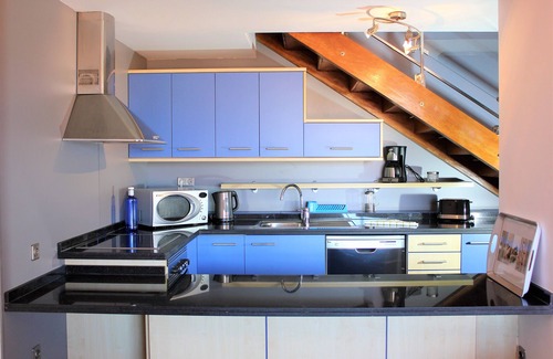 Fully fitted and equipped kitchen, with oven, hob, fridge, microwave, coffee maker, kettle, toaster, juicer, dishwasher, washing machine, iron and crockery