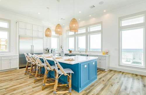 Cook up memories together in the spacious chef’s kitchen. The full size side-by-side refrigerator and freezer easily hold beach snacks plus all the ingredients for delicious meals. The large island is perfect for prep and has seating for 5 while the nearby buffet-style counter is ideal for serving meals. Snacks and drinks are easily prepared at the wet bar area with a wine refrigerator. Gather at the large table that seats 10, or head to the nearby deck to dine al fresco at your choice of 2 outdoor tables, complete with Gulf breezes and sunshine.
