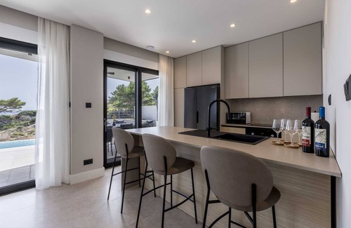 The fully equipped gourmet kitchen invites culinary exploration. Craft delicious meals with locally sourced ingredients and dine in style against the backdrop of the Adriatic Sea.