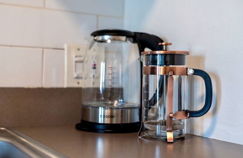 Bedside lamps include power outlets and built in USB-C and USB-A outlets for easy charging. The bathroom boasts a stunning step in shower, while the fully equipped blue kitchenette offers a french press and percolator to enjoy morning coffee and tea, along with a stove, oven, fridge/freezer, and microwave. The kitchenette also includes salt/pepper and olive oil to complement a variety of pots, pans, utensils, plates, bowls, glasses, mugs, and more for your convenience. Enjoy a meal at one of the local eateries or stay in and eat at the kitchen table with 4 matching stools. Stay entertained with a wide selection of cable channels on the TV or login to your preferred streaming service using your personal account. We have provided a list of attractions and a local map for additional exploration during your visit to the seacoast area.