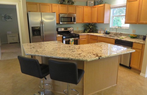 The two car garage comfortably houses your vehicle and our complimentary two seater gas golf cart. The laundry room is conveniently located inside the residence.
