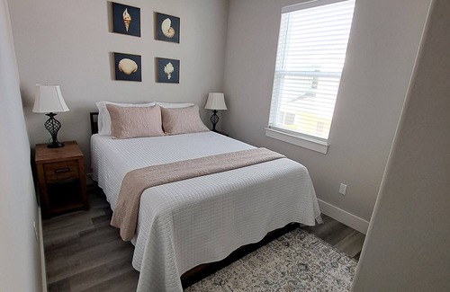 Escape to a peaceful retreat at this 3-bedroom townhome on North Padre Island. With a king bed, full over full bunkbed, twin bed, and queen bed, this gorgeous property offers a comfortable stay for guests. Enjoy the convenience of amenities like WiFi, AC, plunge pool, private yard, BBQ Pit, garage, family games and a washer and dryer. Fully equipped kitchen. Master balcony overlooks Don and Sandy Memorial park that features a playscape, running track, sand volleyball and basketball court. To the right is a boat ramp ( requires a parking pass). Short 5 min drive to the beach. We hope you'll enjoy your stay at our townhome.