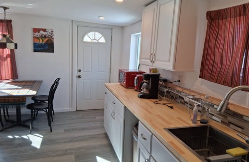 After a day of activities or exploring the region, you will be glad to retire to the popular Adobe CoCo. It has authentic and artful touches, but has also been skillfully updated to provide you with all the modern amenities. It will easily sleep 5 people. There are two bedrooms each featuring a queen-size bed, ceiling fan, and nightstands, and there is a sleeper sofa in the living room. There is a large kitchen for all of your cooking needs. The living area and kitchen spill into one another, making it easy to visit with one another. The full bathroom with shower/tub combination was recently renovated. And for your convenience, you’ll find a washer and dryer in the laundry room. This property boasts an outdoor patio that is ideal for your morning cup of coffee or an evening glass of wine! The property has a fully fenced in yard and a private driveway for two cars, in addition to on street parking. Best of all, your dog is welcome to join you!