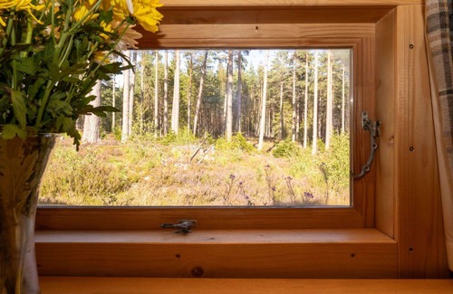 "Birch Bothy", 2-room chalet. Simple and cosy furnishings: open small living room with 1 sofabed and radio. Exit to the terrace. 1 small double bedroom with 1 double bed. Kitchenette (2 hot plates, oven, kettle) with dining table, wood-burning stove. Shower/WC. Wood heating. Terrace furniture. Beautiful view of the forest. Parking (1 car) at the house. Please note: fridge without freezer, non-smoking house. Maximum 2 pets/ dogs allowed. The property is one of a type of property or apartment.