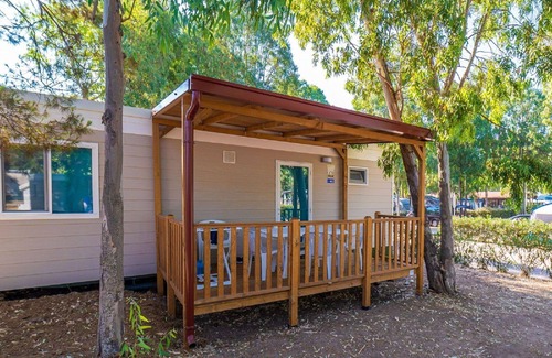 The mobile home is equipped with a kitchenette that has four gas rings for cooking. Air conditioning and forced-air heating are available for your comfort. The terrace area is roofed and includes outdoor furniture for your convenience. Additionally, a hair dryer is provided as part of the facilities. Parking is reserved for one car.