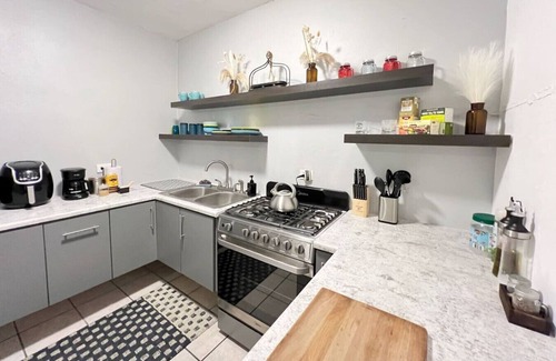 Just remodeled from top to bottom everything is new! Lounge by the bar, sway in the hammock or enjoy the view in the evening by the fire pit. The first bedroom has a new king bed with memory foam mattress and the second bedroom has new queen bed, perfect for a family or group of 4 people. Located 10 minutes from everything. The entire kitchen is furnished with everything you need to make a perfect meal.