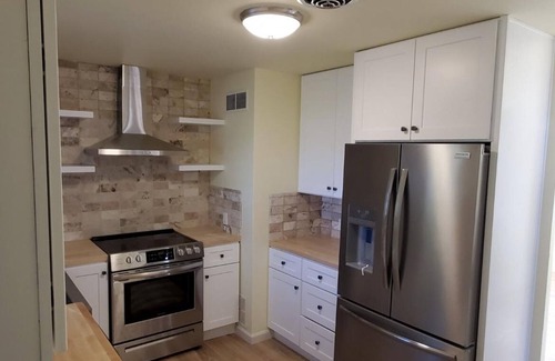Remodeled adorable cottage. New kitchen and bathroom. Walking distance to shopping center. All new furnishings and appliances. Fully fenced in bath yard with a lilac brush. Huge TV with reclining theatre seats. Very quiet.