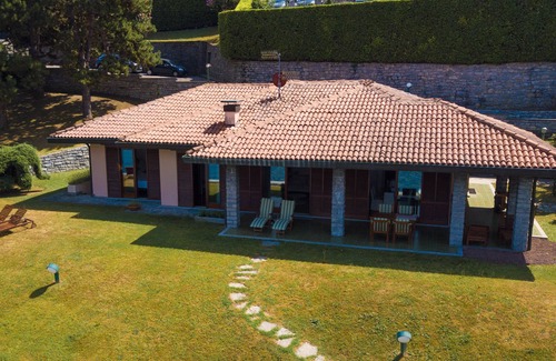 A wide garden surrounds the property, it slops down directly to the lakefront where a private jetty is located. In the back of the villa there is a big barbecue installed inside a rock walls.