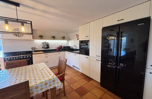 * A huge farmhouse dining kitchen, fully equipped with cooker, dishwasher, fridge freezer, coffee machine, kettle, microwave and toaster. French doors lead out onto the rear terrace for al fresco meals.