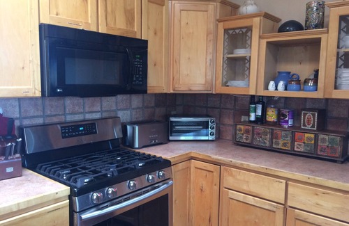 There are two working gas fireplaces one in the living room and the other in the master bedroom. There are skylights in every room - including bathrooms. Yard is landscaped and comfortable - hammock and views under our large aspen trees. At night, Taos sparkles in the distance like a jeweled bracelet, ten miles away.