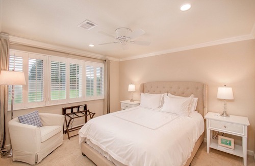 A spacious Mediterranean inspired bathroom with walk-in shower, private “potty room” double vanity-sinks and soft, fluffy towels at the ready. Hair dryer, shampoo/ conditioner/ soap. Washer and dryer with laundry soap/ dryer sheets, iron and ironing board for your personal use.