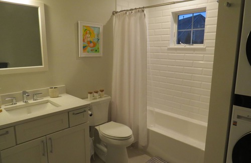 There are two bedrooms; the master bedroom with queen bed, ensuite bathroom, and walk-in closet, and the guest bedroom with two twin beds pushed together to use as a king bed. There is also a spacious second bathroom with shower and laundry closet with stackable washer and dryer.