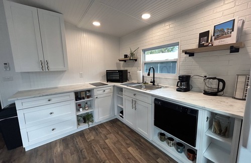 Welcome to our tiny home The Paradise Escape in the beautiful Ramblers Rest Venice, Florida Resort. Enjoy a new two bedroom. one and a half bath, spacious kitchen, nook, and living room, all beautifully furnished and decorated for your enjoyment. As you walk in the living room it has a relaxing couch with additional seating. Perfect for that morning cup of coffee. Kitchen is fully stocked with everything you need including fridge, dishwasher, induction cooktop, and an oven. Nook area, comfortably seats 4 and looks out into a beautiful park with a large window. Master bedroom offers a full size bed, flatscreen TV, large closet, and the desk to catch up on your emails. Master bathroom has a full standup shower and large vanity. Second bedroom offered twin bunkbeds, as well as a mini fridge and has a separate entrance to the back porch. Second bathroom is a combination of bathroom/laundry with stackable, washer and dryer. Backyard has a relaxing lanai set and some green belt.