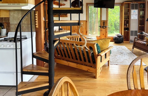 Inside, a wall of windows welcomes in natural light and stunning lake views. The open-concept first floor includes a cozy kitchen, dining area, and living room warmed by a wood-burning stove. The living room also features two futons, providing additional sleeping arrangements for guests. A full-size bed is located in the downstairs bedroom, while a spiral staircase leads to a loft with a twin and full bed, plus an air mattress—an ideal place to wake up surrounded by treetops and tranquility.