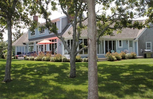 Magnificent, wraparound saltwater views of the Atlantic Ocean, Nauset Beach, Strong Island, Bassing Harbor and north to Pleasant Bay and Orleans from this luxury home located at end of a quiet road located in a private association in North Chatham. High on a bluff, it is one of the preeminent waterfront locations anywhere in Chatham, available for only a few select weeks each year. 4500 square feet of classic, comfortable Cape Cod style, all cooled by central air conditioning with multiple zones. This home's upgraded furnishings help it stand out from others with a more casual feel. Beautiful water views from every room in the house, including the five bedrooms, (4 Queens, 2 Kings, 1 Daybed) and four and half baths. Greet the rising sun every morning and watch the sailboats, powerboats, and fishing boats as they leave Ryder's Cove to head out to the harbors and the Atlantic from your expansive deck. The view of nearby islands and the National Seashore beach in the distance is stunning. Walk down your private stairs to your 300 feet of private beach, perfect for launching a kayak and stroll 2 houses away to the association beach for shelling and swimming. Finish the day in our luxuriously appointed home with a full chef's kitchen, formal dining and sitting room, casual family room with plenty of seating, cable TV and entertainment system. Watching the moon rise over the beach is truly memorable. Upon arrival, guests will receive a Welcome Bag containing a reusable tote starter pack filled with essential paper and cleaning products for their stay. This charming home is ideal for creating lasting family vacation memories year after year. Call us at Chatham Rentals and let us help you plan your stay.