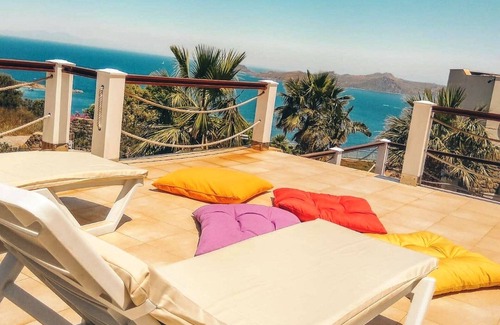 Myndos is a beautifully furnished three bedroom three bathroom duplex villa with stunning views of the Aegean Hills and coastline.