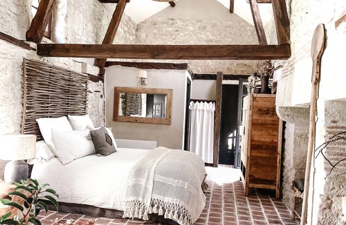 The Boulangerie, with its two bread ovens used 300 years ago by the whole hamlet of Pragelier, is comfortable and romantic with its 35 m² of floor space and private terrace overlooking the fields. It features a sitting area, private terrace, separate toilet, pure linen bedding, bath and pool towels, hairdryer and ironing facilities available on request.