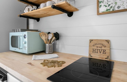 Step into the sweet buzz of relaxation at *Bee at The Hive*, a charming, bee-themed container home designed for comfort, fun, and unforgettable moments. This thoughtfully crafted 1-bedroom, 1-bath retreat features a cozy queen bed, a full bath with a walk-in shower, and a delightful mini-kitchen equipped with a cooktop, toaster, and blender—perfect for whipping up your favorite snacks or morning smoothies. Relax in the cozy seating area with a Smart TV or enjoy breakfast at the bar as sunlight streams in through large windows.