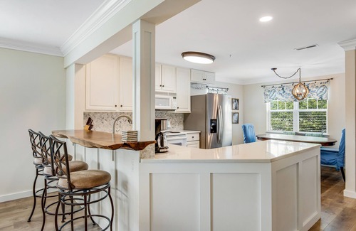 Recently renovated and offering a variety of resort amenities for guests, this sleek and sunlit, second-floor condo is ideal for a couples retreat or a small family vacation. Stock up your full-size refrigerator and prepare home-cooked meals in the well-equipped, eat-in kitchen with a wood-capped breakfast bar and a table for six. Meet up in the cozy living area, switch on the gas fireplace, and watch something together on the cable-equipped flatscreen TV. Outside, dine on the front porch or take in the view of the adjacent marsh from the furnished, screened-in back patio - a great place to watch for birds and other wildlife. You and your guests will also enjoy access to several Bethany Bay amenities including a shared pool, tennis, basketball, and volleyball courts, and a nine-hole, par-three golf course, all on-site.
