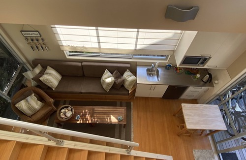 The 2 story, fully self-contained studio is situated at the rear of the main house and includes 2 bedrooms. There is 1 bedroom upstairs, and 1 downstairs in the studio. Both bedrooms have a queen bed and one single bed. There is a kitchenette and a small living area in the studio, and 1 bathroom.