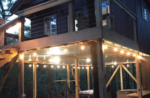 This 2021 built treehouse cabin is located in a pine & hardwood forest. There are 2 Treehouses approximately 100 yards apart through the forest. The cabin has a king size bed & a full size sleeper sofa. It has a soaker bathtub as well as a shower. It has a full kitchen with all cooking essentials, an outdoor grill & fire pit. Firewood is provided. The deck downstairs has a hot tub, hammock chairs & a swinging bed. The property joins Ouachita National Forest.
