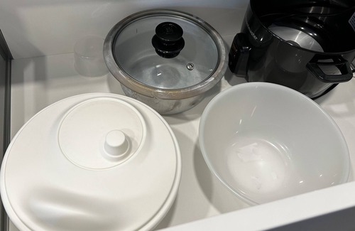 -Full kitchen with oven, fridge, glass stove top, microwave, equiped with essentials to make everyday meals (pots, pans, plates, spoons forks, cups, wine glasses, basic spices, cooking oil, toaster, kettle, cleaning supplies, rice cooker, baking sheets)