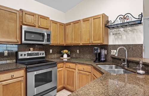 The kitchen is fully stocked and has all new appliances, granite countertops, with laundry access. The laundry room has a full size washer and dryer. In the laundry room you will also find plenty of storage for vacation items.