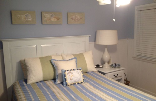 Great family rental. Threee bedroom one bath condo with views of ocean from den, master bedroom, and front balcony. Cherry wood hardwood floors run throughout the bright and sunny unit. One queen bed, one double bed, and two twin beds are in the house. The sofa bed is a pull out. We provide bed linens and towels in condominium for use while you are there. Only a block to the beach and park, and convenient to town.