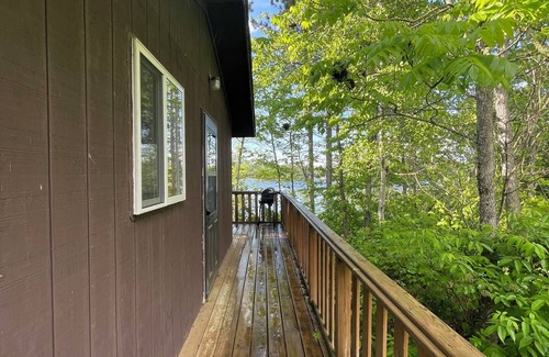 This two bedroom cabin overlooking Jasper Lake has a yard and deck, and is surrounded by vegetation for privacy. There is a full kitchen, bathroom, and living room with dining table, two recliners, and a couch. Bedroom 1 has one double bed, bedroom 2 has a double and a twin bed. Outside, the deck overlooks the lake and has a picnic table and extra chairs. There is a gas grill.
