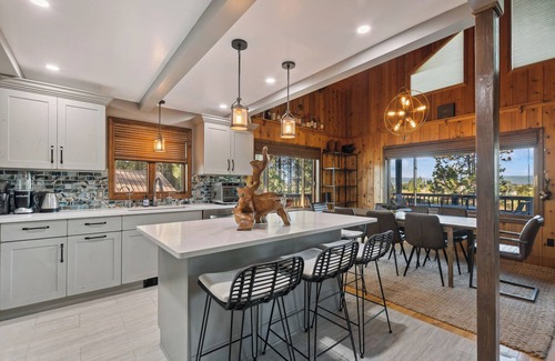 Step into the cabin’s foyer via convenient keyless entry and make your way to the open-concept living/dining/kitchen area. Draw your eye up to the soaring ceiling and feel the airy spaciousness. Settle into buttery leather seating and relax by the warmth of the woodstove. The large coffee table is the perfect spot to play board games.
