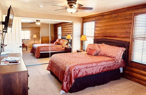 Entire cabin, multilevel and four bedrooms with a playroom! Designed to be your home away from home! This beautiful log cabin home is the perfect getaway for your next vacation with spacious and well equipped kitchen and dining area. Flat screen TV with basic cable access in the living room. Kitchen is equipped with toaster, electric kettle, drip coffee maker (coffee NOT provided), toaster oven, blender and more!