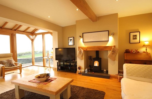 The dining area has a table lovingly made by the Owners. There are eight leather chairs, a wood burning stove and oak floors with underfloor heating making a great space for family meals.