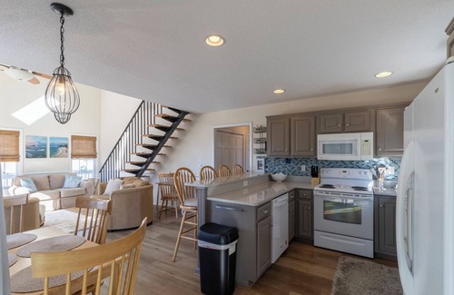 Wide, wraparound decks invite you up the front stairs with cheery, colorful touches on the exterior of the home. As you enter, you’ll experience the thoughtful and charming coastal décor and open floorplan suitable for enjoying family togetherness. The main level includes a well-appointed eat-in kitchen with seating for 4, plus 4 counter height barstools, and access to the sunroom for the ultimate in relaxation and serenity.