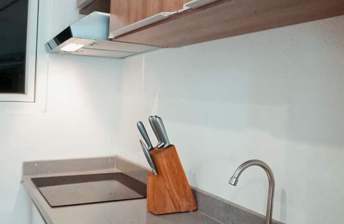 Área de Cocina con pantrie, refrigeradora, microondas, cocina, cafetera, platos, cubiertos, sartenes, ollas, tazas, licuadora y área comedor independiente. Baño con suministro de agua, toallas, jabón, papel higiénico, secadora de cabello, etc. Área de lavado con lavadora. Planchador y plancha disponible.