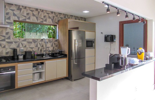 - A cozinha americana tem tudo que você precisa para preparar refeições, cafeteira, freezer, fritadeira, fogão, geladeira, liquidificador, micro-ondas, balcão e exaustor