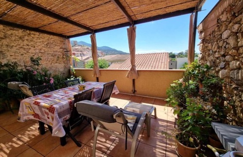 Very quiet cottage located in the heart of a Mediterranean village. You are close to all shops, the weekly market, restaurants and public services. Gîte classified 3* since 2010. The pleasure of coming and going on foot, wandering around and coming back home whenever you want. You are 200 meters from the start of hikes in the Albères massif, 10 km from the beaches, 15 km from Collioure, 15 km from the border, 25 km from Ceret. It is a village house, not overlooked. Surface area: 55 m² plus terrace (25 m²). Fully equipped. On the 1st floor, a light and bright living room, and a kitchen-dining room. These two rooms open onto the terrace. Two bedrooms: one with 1 140 bed; the other with two 90cm beds. Shower room and separate WC. The shaded terrace offers a magnificent view of the medieval village, the Albères, the Canigó massif and the Corbières in the distance. Garden furniture and barbecue. The shaded terrace offers a magnificent view of the medieval village, the Albères, the Canigó massif and the Corbières in the distance. Garden furniture and barbecue. On the ground floor garage for cars, bicycles, motorcycles and windsurf boards. Access is preferable for a medium-sized vehicle because the street is narrow, free WiFi (fiber) and Orange TV.