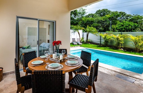 This gorgeous villa is bright and open with brilliant airflow. Relax at the large private pool or enjoy Costa Rica’s tropical ecosystem at the lovely dining table on the porch. All the bedrooms have A/C for comfort during the night. Fully furnished, equipped and decorated with great contemporary style, attention to detail and comfort.