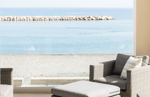 Unique villa on the sea, rooftop pool, panoramic views, walking distance to "everything". Best location at the end of the promenade, in the village of Kolymbari, west of Chania. Only 10 meters from the beach.
