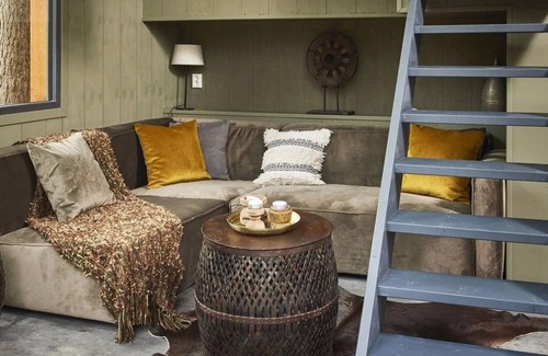 This cosy, wooden Tiny House 4 is suitable for 4 people. Although it is small, it is cleverly laid out and fully equipped. Together with other Tiny Houses, it borders an open-air courtyard, often with lounge sofas, hammocks, a barbecue and a (shared) hot tub*. The living room has a cosy sitting area with television. The kitchen is equipped with an induction hob, electric kettle and a Nespresso Machine. Downstairs is a bedroom with a double bed and via a staircase you will reach the sleeping loft with another 2 single beds. Your tiny house has a bathroom with shower and toilet. Outside there is a cosy terrace with garden furniture. There is a central parking space and free wifi is available.
