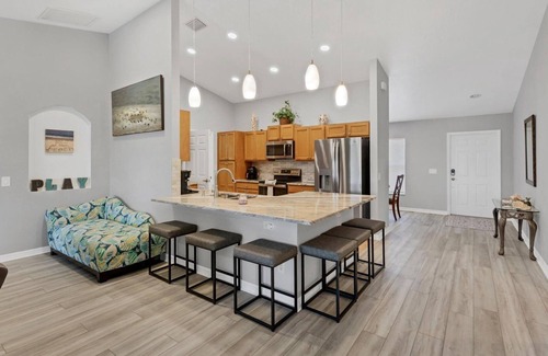 Brand new 4 BD, 2 BT villa in quiet waterfront community. Sparkling pool overlooking canal. Open kitchen with gorgeous countertops. Lanai with pool and chaise loungers. Pet-friendly with additional fee. Garage available. Full-size washer and dryer. BBQ included. Welcome pack provided. Free parking and WiFi. Sleeps up to 8. Optional pool/spa heating. Close to Gulf Coast beaches, golf, and dining. Cleaned with enhanced safety measures. No check-in required.