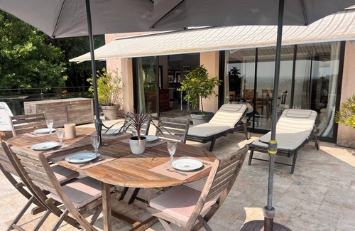 The terrace (stone tiles) is equipped with a teak table and chairs, as well as four teak lounge chairs. Barbecue/Plancha