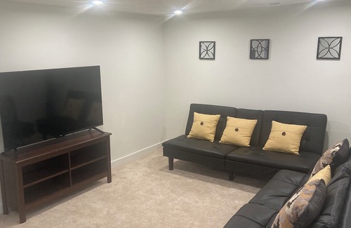 Stay comfortably in Saratoga Springs at this 2-bedroom basement apartment. This delightful property features 2 queen beds, 1 sofa bed, and 2 futons, perfect for a tranquil getaway. With 2 bathrooms and a cozy living room with 4 twin folding mattresses, guests will have plenty of space to relax. Enjoy amenities like fully equipped kitchen, dishwasher, large refrigerator, WiFi, a washing machine, a dryer, and AC and heat during your stay. You're sure to make fantastic memories with a stay at our place. 5 minutes drive to all shopping and restaurants.