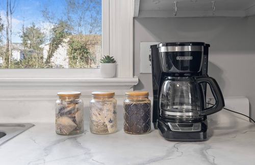 The kitchen and spacious dining table are ready to host you. Full kitchen set ready for your disposal including: pots, pans, cookware, utensils, plates, bowls, cups/mugs, cutting boards, wine opener, can opener, kettle, microwave, and spices. Coffee station that includes coffee grounds, tea bags, and sugar free of charge. BRITA water pitcher included for your use. Large stainless steel fridge that can accommodate weeks worth of groceries.