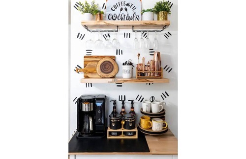 The coffee and cocktail nook is equipped with the following: charcuterie boards, charcuterie utensils, wine opener, bottle opener, wine glasses, champagne flutes, an 18 piece bartender drink set, a Ninja Coffee and Tea Maker with a frother attachment, free provided coffee and sugar in containers next to the coffee maker, 3 different flavor of coffee syrups, large and small coffee mugs, a coffee grinder, a microwave, a retro 4-slot toaster, free dog biscuits, and a bin for extra storage of bottles or whatever needs storing, and a first aid kit in the drawer.
