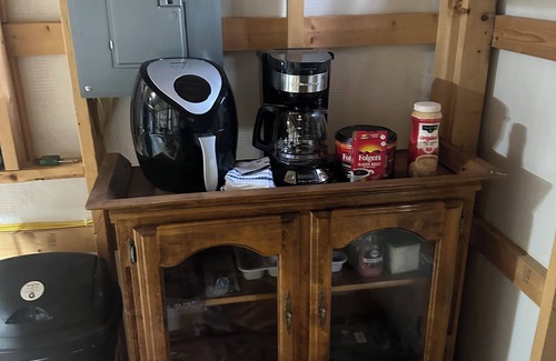 This Versailles cabin sleeps 4, 1 queen high quality air mattress in the loft and 2 additional fold out high quality cots. Cabin boasts AC and heating guests can stay comfortable year-round and a pond for fishing. Sectioned off bathroom features a refreshing campers shower with stand in shower tub... and toilet equipped with bio-degradable waste bags, There's even a cozy living room with a futon for additional space. We think our place will help you experience everything Versailles has to offer. This comfy get-away has a flatscreen, inside and outdoor games at your disposal. Local Tv channels are available. Also included is a coffee maker (with coffee), air fryer, fish fryer and hot plate. There is also a vacumn and shampoo machine. Toiletries are included. The cabin also has a washer and dryer. You must bring your own water for drinking, bathing and cleaning. Cabin is 12 minutes from the Lake of The Ozarks. There is plenty of parking and outside seating. Enjoy all nature has to offer on this 6 acre property.