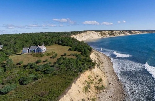 Perched on a bluff on the south shore of Chilmark (MV), Clethra (means "summer sweet") is an original 1929 Vineyard cottage with a stunning water-front location that offers unmatched 270 degree views. To the left is a long crescent beach below the Wequobsque Cliffs that curves down to Lucy Vincent beach, and to the right is Stonewall and Squibnocket beaches. Stonewall Beach is a private beach assoc. You can walk a few minutes or drive to beach parking. Beach access is limited to those who live or rent on the road.