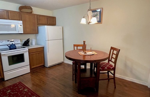 Step into the welcoming living room, designed for relaxation and entertainment. Sink into plush seating and enjoy your favorite shows or movies on the 55" smart TV. The open floor plan flows seamlessly into the dining area, which features a cozy table with seating for four, perfect for casual meals or intimate dinners. Adjacent to the dining space, you’ll find an eat-in kitchen, fully equipped with modern appliances and ample counter space, making meal preparation a breeze.
