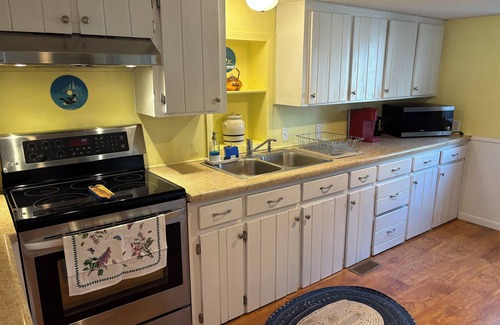 This quaint yet spacious ‘rural-naturalist’ cottage in Park Rapids is the perfect spot for guests looking for a relaxing getaway just blocks from both downtown and the Heartland Trail/Park. The master bedroom boasts a king-size bed and spacious closet while the 2nd bedroom features a charming wrought iron day bed and reading nook. Two sofa beds in the living room provide extra room for spreading out or enjoying company. Relax in the jetted bathtub, soak up the sun lounging on the sun-deck or grill out under the fairy-lighted porch. Bring your furry friend and relax knowing the small fenced in yard will keep them safely enclosed nearby. Enjoy the convenience of amenities like AC, WiFi, smart TVs in both bedrooms and living room, and a washing machine and dryer. Naturalist inspired decor and field guides throughout the space invite you to follow your curiosity to the nearby Heartland Park - take a stroll across the river and find your self a block from downtown Park Rapids which features weekly live music all summer long.