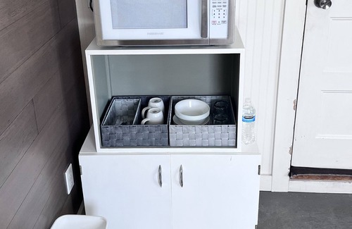 A small table and two chairs are provided, as well as a set of dishes for all your basic dine-in needs. A microwave and mini-fridge allow for simple food prep or leftovers. Coffee and tea are offered, with an electric kettle, a 12 cup coffee pot, and ceam and sugar. A cooler tote bag stored next to the fridge can be used for grocery trips, picnics, etc please remember to return it before checking out. The table and chairs each can be folded up if more room is needed.