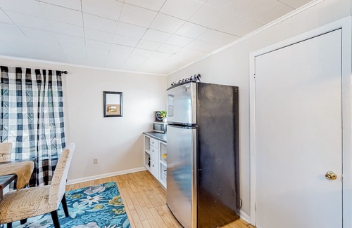Inside this two-story, 19th-century vacation rental, you'll find a well-equipped, open-concept kitchen with a breakfast bar, a large dining table for mealtimes or family board game nights, and a comfortably furnished living area with a sofa bed and smart TV.
